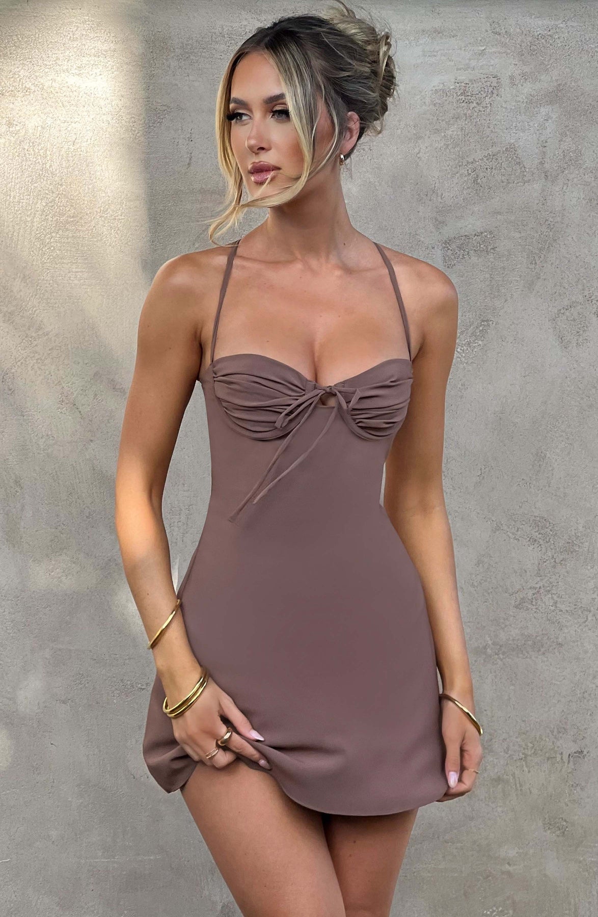 We're obsessed with the Renee dress, an elevated mini made in our luxury non-stretch satin and delicate chiffon. With halterneck straps and a pretty ruched bust with underwired cups, the design snatches at the waist and gently flares at the hem.